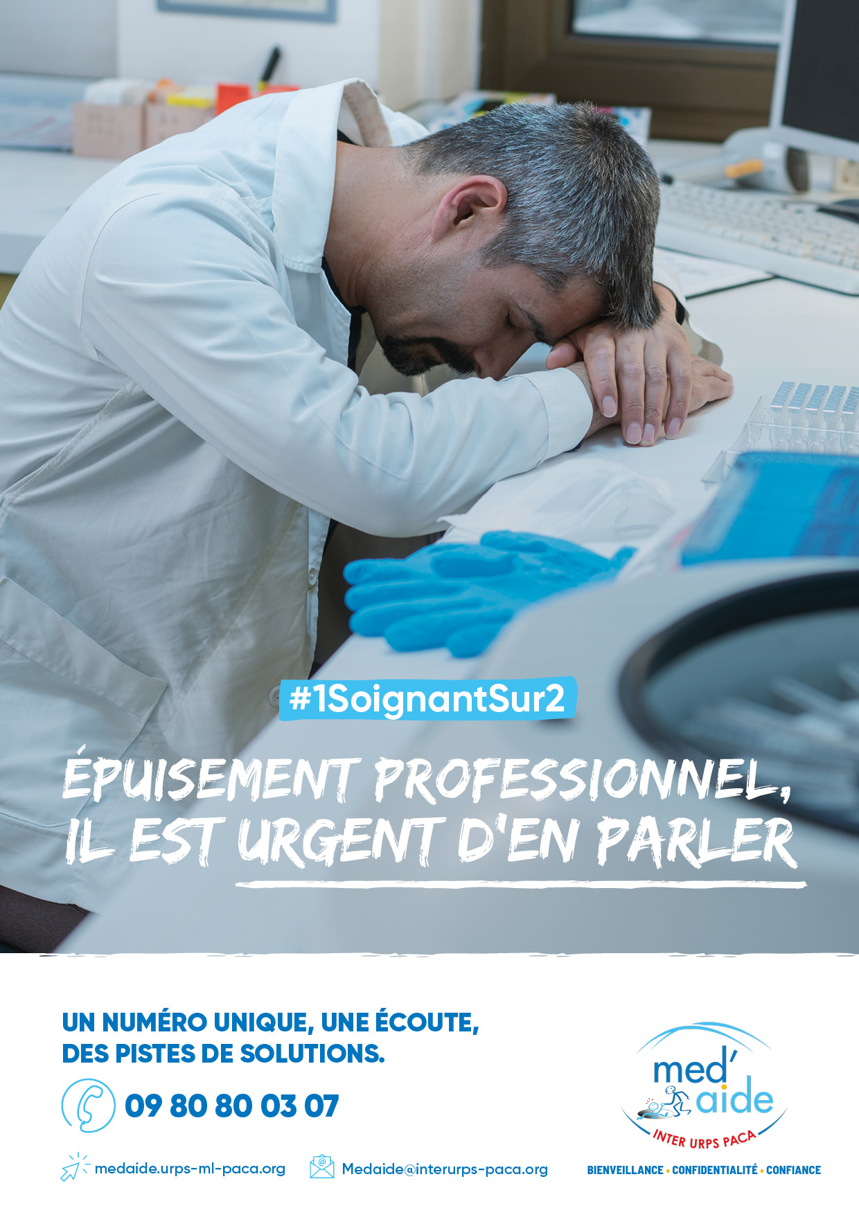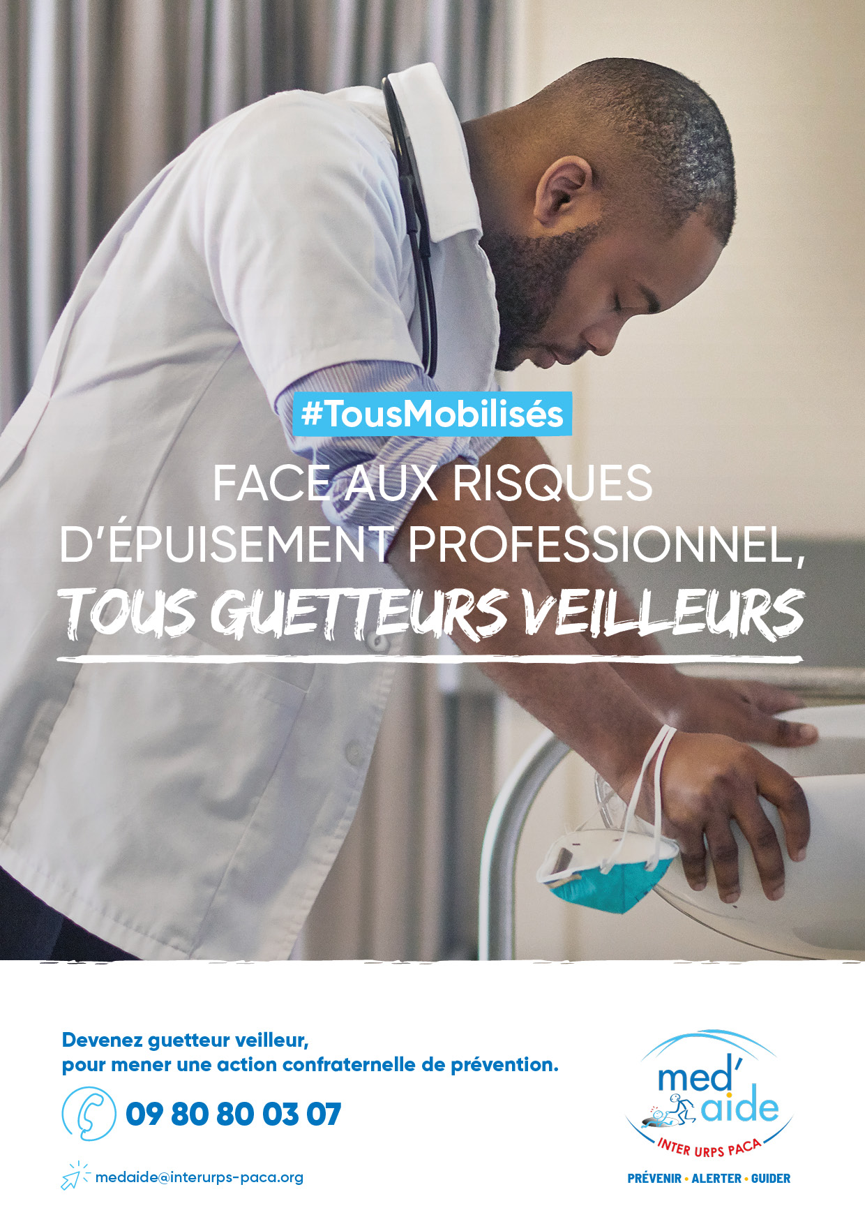 Face à l’urgence, les URPS PACA ont décidé d’agir. Elles s’unissent pour renforcer le dispositif MED’AIDE, élargi à l’ensemble des professionnels de santé en ville. À l’occasion de ce lancement, l’inter URPS a déployé une vaste campagne de communication à la fois pour informer les soignants sur ces problématiques et les mobiliser pour qu’ils deviennent acteurs de la prévention de ces risques en devenant guetteurs veilleurs.